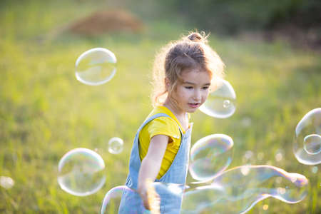 Portrait of a cute little girl blowing soap bubbles in the park in summer.