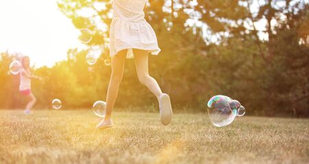 Kids playing with bubbles in summer in the nature