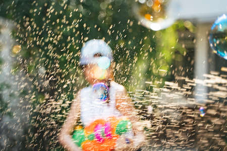 playful child blowing soap bubbles from a bubbles gun in a garden