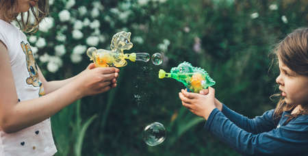 Pony, dinosaur soap bubble gun shooter, blower. Battle, party for kids. Girls,chidren playing funny family game with sister,girl. Outdoor activities in summer in green park. Big flying bubbles.