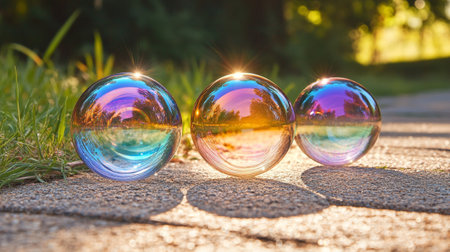 Colorful glass balls on the ground in the park in the sunlight