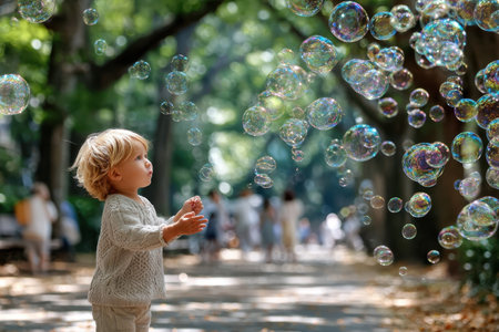 A young boy is enjoying a sunny day in the park, blowing bubbles with a joyful expression while surrounded by nature's beauty and warmth.