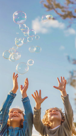 A boy and girl are happily playing with soap bubbles in the air, surrounded by the beautiful sky and clouds