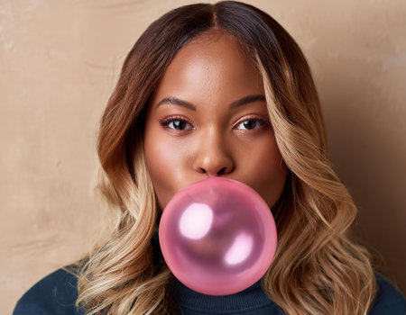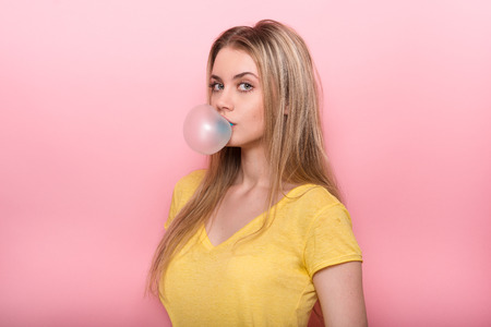 Close-up portrait of a beautiful woman blowing a bubble gum, studio photo