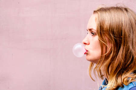 A beautiful girl on an isolated background of a pink tint stands in a profile and puffs a ball of a chewing gum. The bubble turned out great.