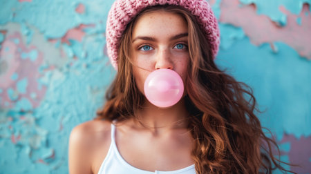 Fashionable teen with pink beanie and bubblegum in front of a peeling blue wall, showing youth and trendiness