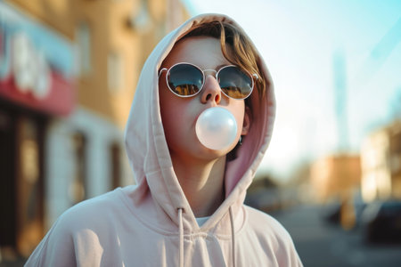 Stylish Teenager With Trendy Sunglasses And Hoodie Blows Bubble Gum In Cool Pose
