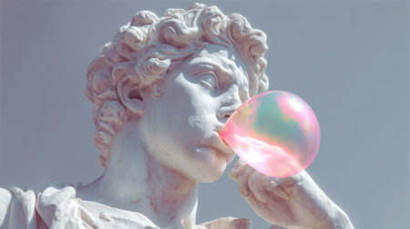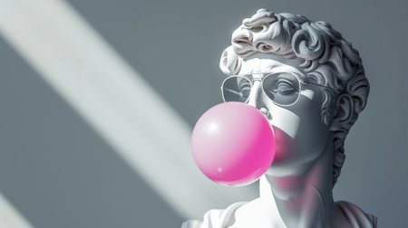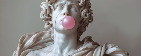 A classic sculpture of a male figure is depicted blowing a vibrant pink bubble gum, contrasting with a soft pink background. The piece highlights a blend of tradition and contemporary humor.