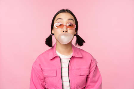 Stylish asian girl blowing bubblegum bubble, chewing gum, wearing sunglasses, posing against pink background