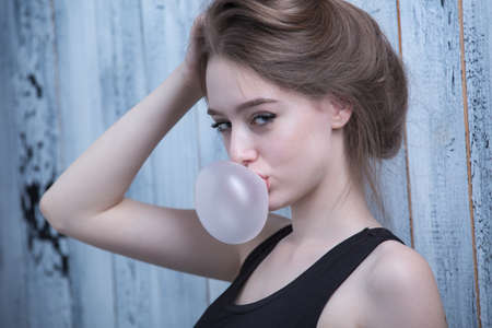Portrait of sexual brown-haired, which inflates languidly pink bubble of chewing gum. Photographed in studio on a britht wodden background.