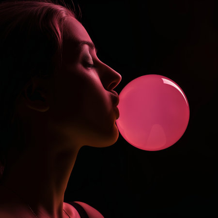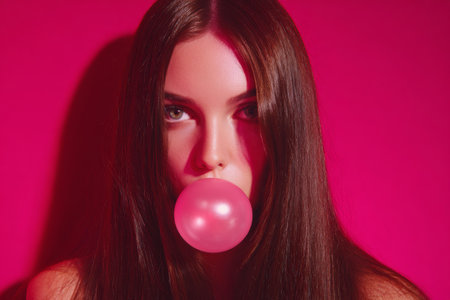 A model faces the camera, blowing large pink bubbles. Long shiny hair partially covers her face against a dark pink background. The colors appear vibrant and bold, creating an eye-catching scene.