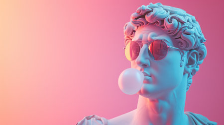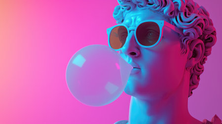 A marble statue reminiscent of classical art blows a vibrant pink bubblegum, set against a dynamic backdrop with glowing neon lights, creating a striking fusion of styles.