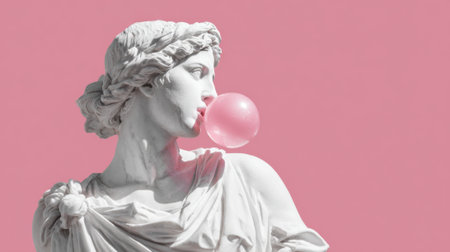 A classical marble statue of a female figure is blowing a bubble with pink gum. The striking contrast against the light pink background adds an element of fun to traditional art.