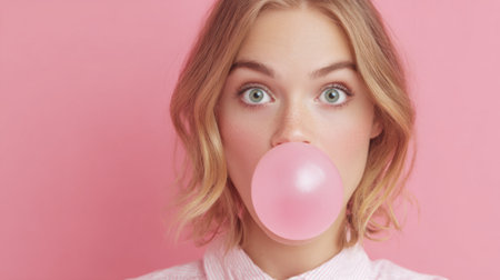 A young woman displays a playful expression while blowing a bubble with gum against a vibrant pink background. This portrait captures joy and spontaneity, reflecting youthful energy.