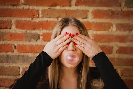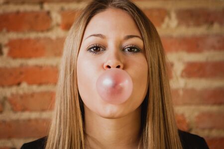 Funny girl making a pomp with a bubble gum and a brick wall of background