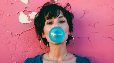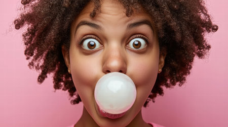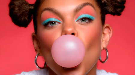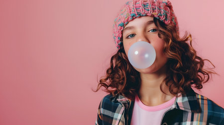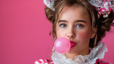A charming portrait of a young girl blowing bubble gum against a bright pink background, radiating joy and playfulness with her vibrant style and expressive features.