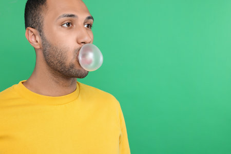 Man blowing a large bubble gum bubble against a pink backdrop with closed eyes, showcasing playful expression and casual style