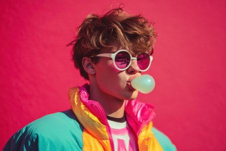 Trendy young man in colorful 80s-style neon clothes blows bubble gum, evoking fun, vintage style, and street fashion.
