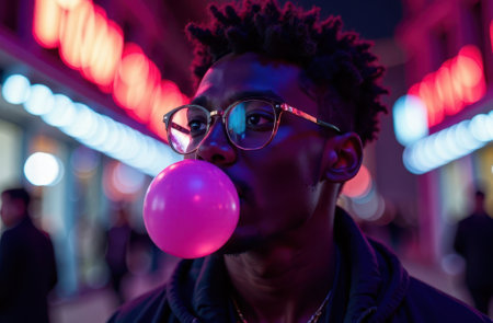 A cheerful young man in a colorful neon setting, joyfully enjoying bubblegum, radiating energy
