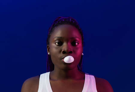 Minimal portrait of young African-American woman blowing bubblegum bubble and looking at camera while standing against purple background in studio