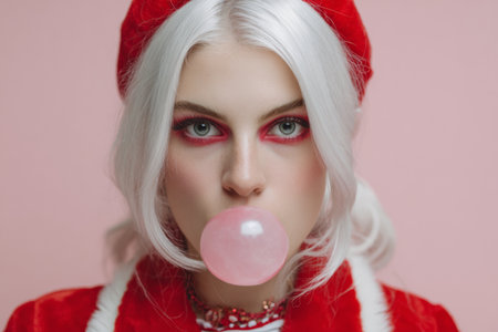 A young woman with white hair poses confidently while blowing a bubblegum bubble. She wears a Christmas outfit with red accents and has red eyeshadow and lipstick.