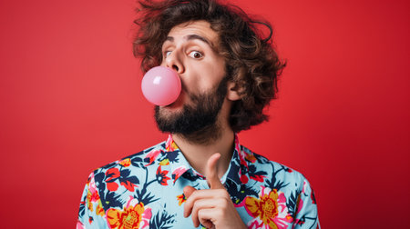 Portrait of a happy young man in summer shirt blowing a bubble gum isolated over red background