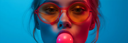 Close up portrait of a beautiful young woman wearing red glasses and blowing a bubble gum.