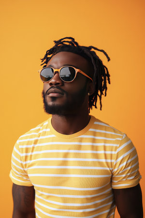 Man in sunglasses and striped shirt poses against vivid orange backdrop
