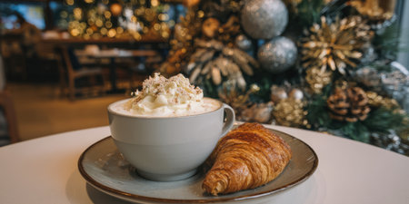 Hot chocolate with whipped cream and sprinkles next to a golden croissant, sitting on a white table with a festive christmas tree and blurred lights creating a cozy holiday atmosphere