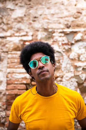 Vertical portrait of cool and confident black man wearing sunglasses outdoors. Copy space.