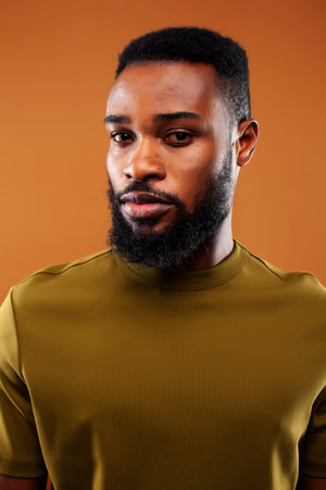 Young black man with beard posing and looking at camera isolated over brown wall
