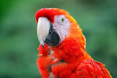 Close up portrait of macaw red head Ara with green background.