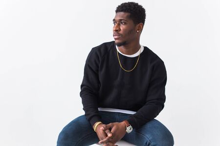 Young handsome african american man with an afro hairstyle. Portrait on white background. Guy looking aside.