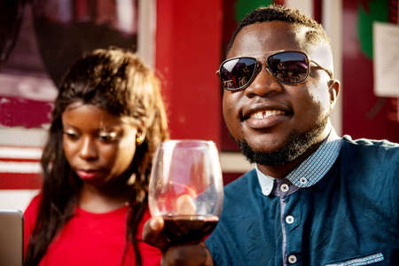handsome young man wearing sunglasses drinking a glass of red wine smiling, beautiful woman back background