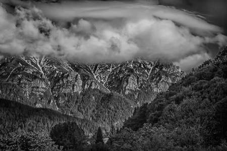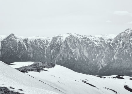 Scenic view from Baiului Mountains with the snowy peaks of Bucegi Mountains. Carpathians in Romania. Black and white photography.