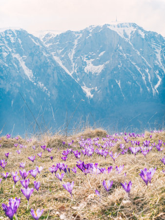 A mountain pasture filled with Crocus heuffelianus or Crocus vernus (spring crocus, giant crocus) purple flowers. Carpathian Mountains in Romania.
