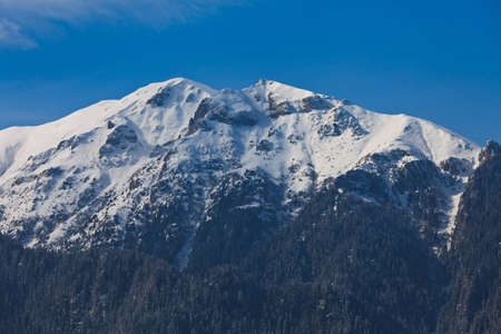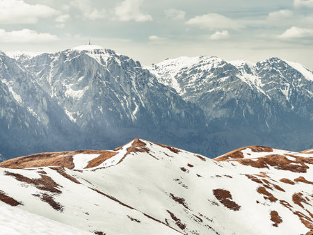Scenic view from Baiului Mountains with the snowy peaks of Bucegi Mountains. Carpathians in Romania.