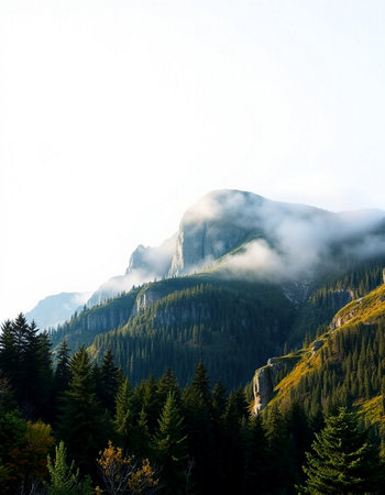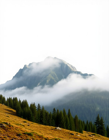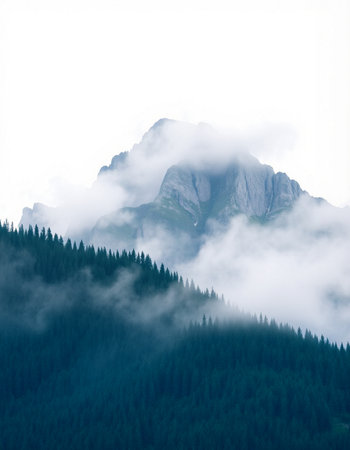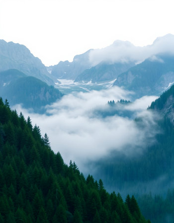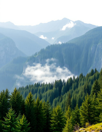 Mountain landscape with coniferous forest and fog in the valley