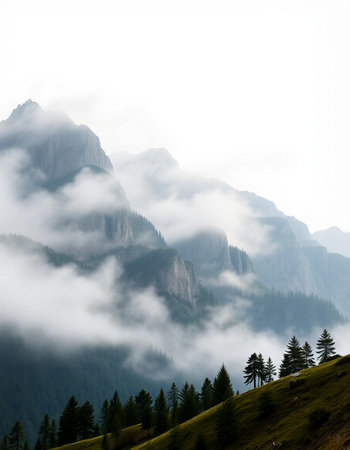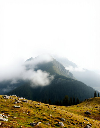 foggy mountain landscape with clouds above the peaks