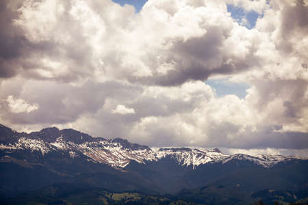 Heavy clouds over the Bucegi mountains in Romania during a spring day, as seen from the hills of Pestera village.