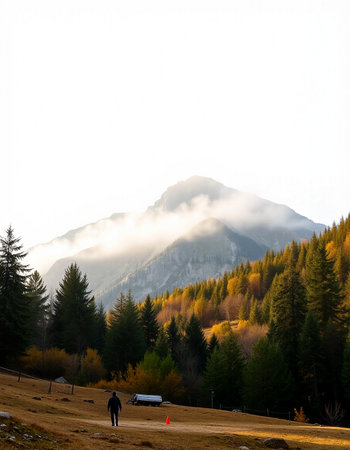 Autumn landscape with colorful forest and high mountains in the background.