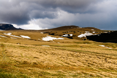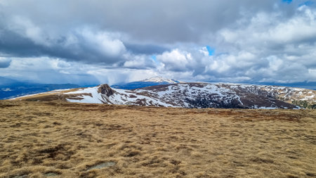 Heavy clouds over the Bucegi mountains in Romania during a spring day, as seen from the hills of Pestera village.