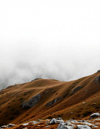 Foggy mountain landscape with rocks in the foreground and copy space
