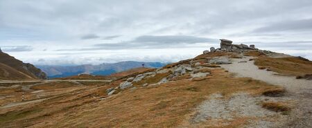 Landscapes with blue sky and clouds, Route through the mountain peaks and hills through the majestic. Active tourists hiking in the mountains of the Caucasus Austin First. Sport lifestyle concept