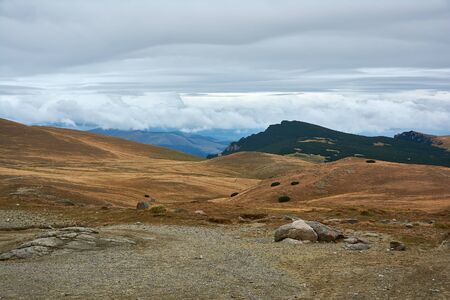 Panorama road after rains in Mountain Foggy Carpathian Mountains peaks on a foggy autumn morning. Bucegi Mountains, Romania Europe