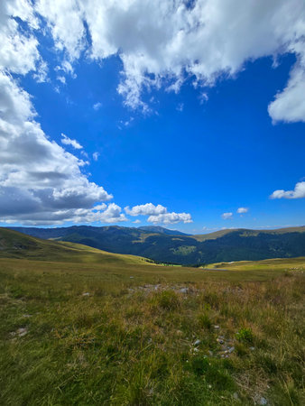 Beautiful view over the valley and Parang Mountains from the height of the Transalpina Road on a beautiful summer day. Valcea, Romania
