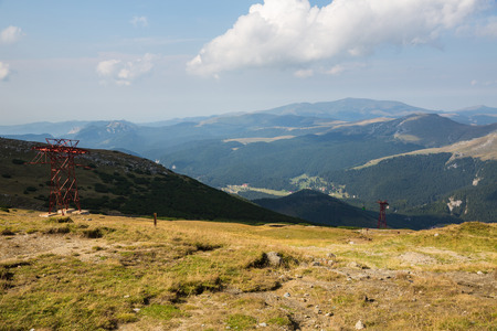 Mountain landscape in Bucegi Natural Park near Busteni, Romania. Pylons of mountain cable car in the Bucegi Mountains.