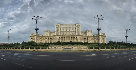 BUCHAREST, ROMANIA - 07.20.2018. Panoramic view of the Romanian parliament in Bucharest in a gloomy summer morning