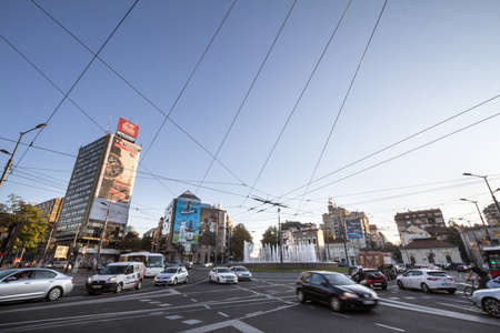 BELGRADE, SERBIA - OCTOBER 24, 2019: Traffic jam of car and public transportation buses on rush hour on the roundabout of Trg Slavija square with its iconic fountain at dusk.