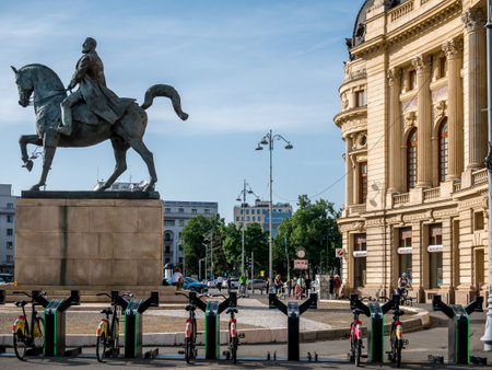 Bucharest/Romania - 05.16.2020: Carol I University foundation and Central University Library of Bucharest. An emblematic bulding in Bucharest. Rent a bike service bicycles and the Statue of Carol I.